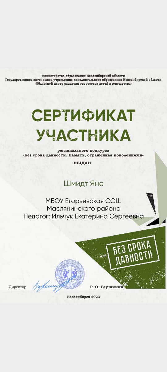 Диплом участника регионального конкурса "Без срока давности"